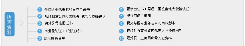 1、外國(地區)企業有權簽字人簽署的《外國(地區)企業常駐代表機構設立登記申請書》(原件1份);